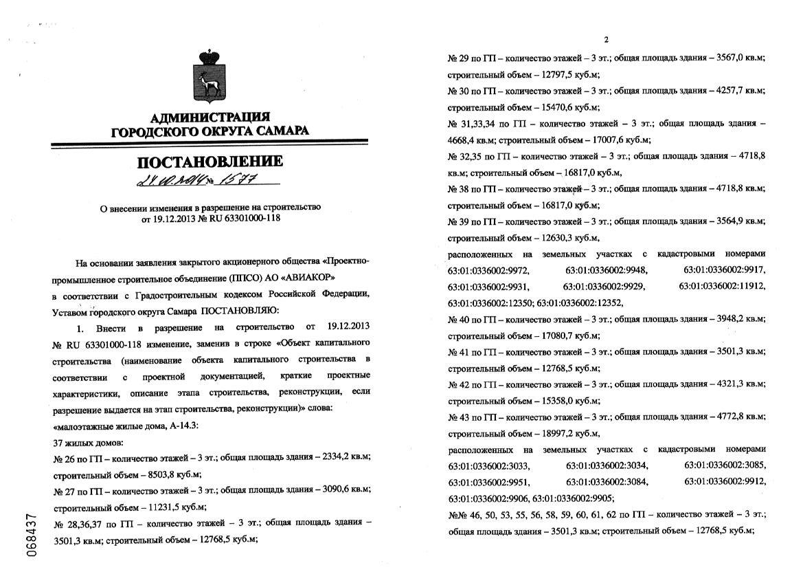 Постановление о внесении изменений в Разрешение на строительство от 19.12.2013г. объекта "Малоэтажные жилые дома, А-14.3" от 24.10.2014г.