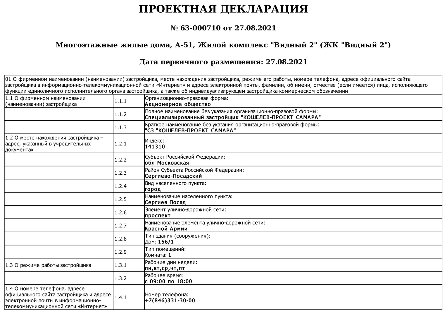 Проектная декларация "Многоэтажные жилые дома, А-51, Жилой комплекс "Видный 2" (ЖК "Видный 2") от 27.08.2021