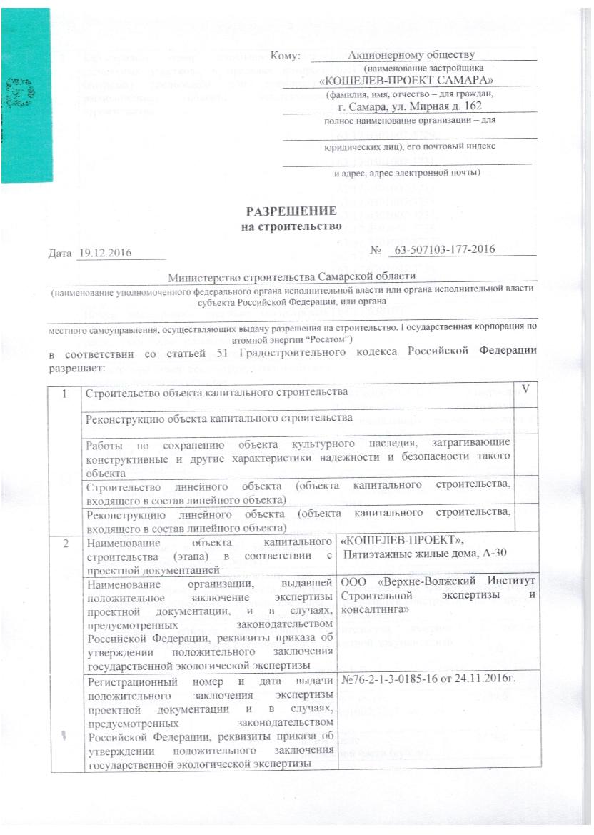 Разрешение на строительство "КОШЕЛЕВ-ПРОЕКТ" Пятиэтажные жилые дома А-30, от 19.12.2016г.