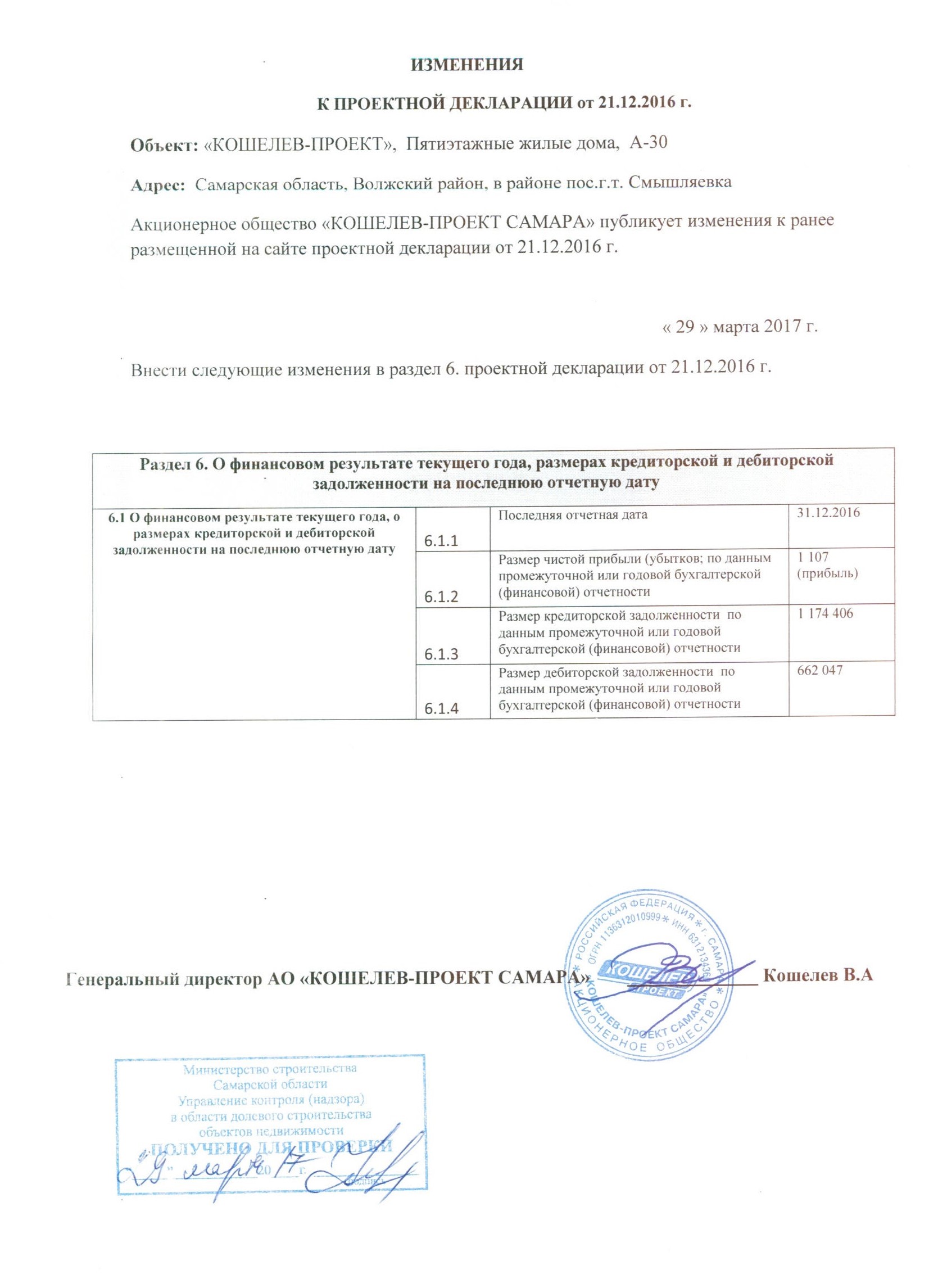 Изменения к проектной декларации объекта "КОШЕЛЕВ-ПРОЕКТ", А-30, от 29.03.2017г.