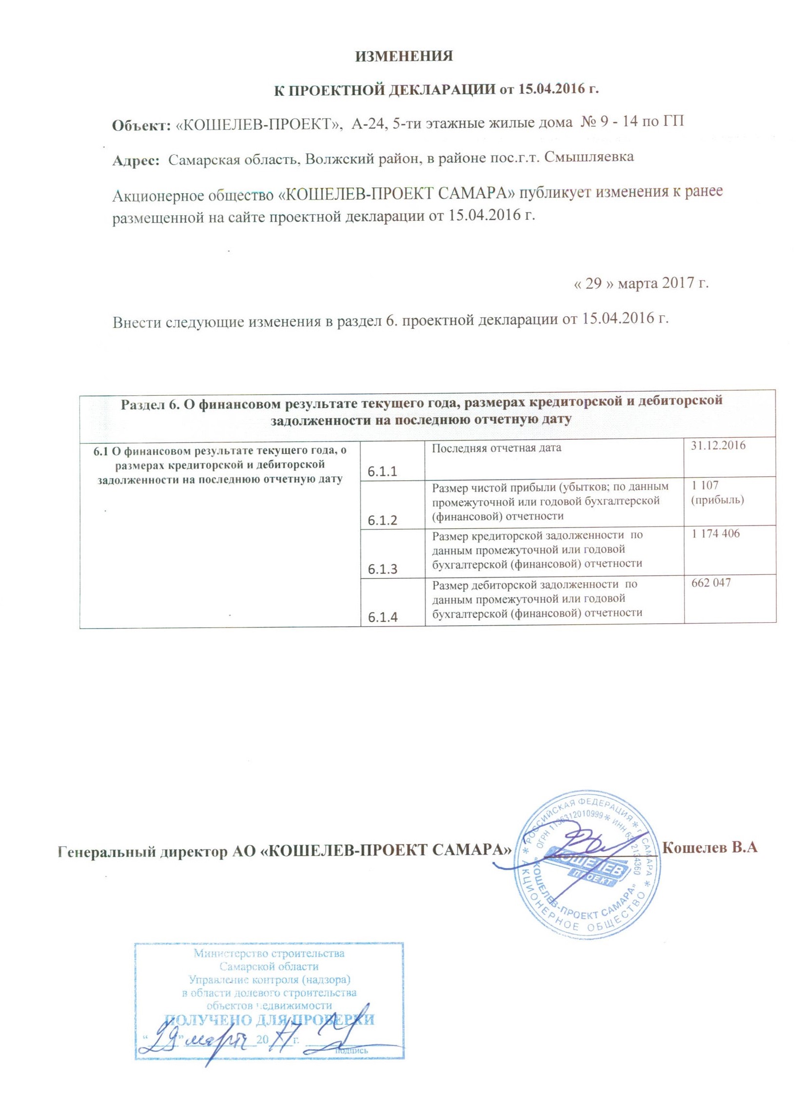 Изменения к проектной декларации объекта "КОШЕЛЕВ-ПРОЕКТ", А-24, от 29.03.2017г.