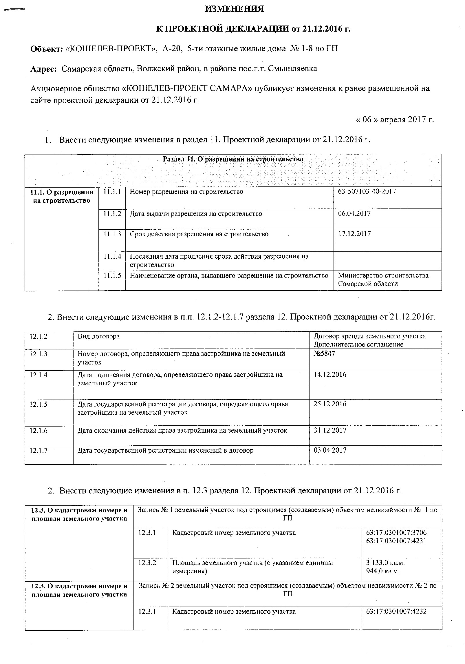 Изменения к проектной декларации объекта "КОШЕЛЕВ-ПРОЕКТ", А-20, от 06.04.2017г.