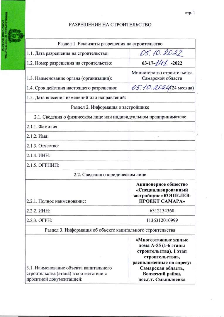 Разрешение на строительство А-55.1 (05.10.2022)