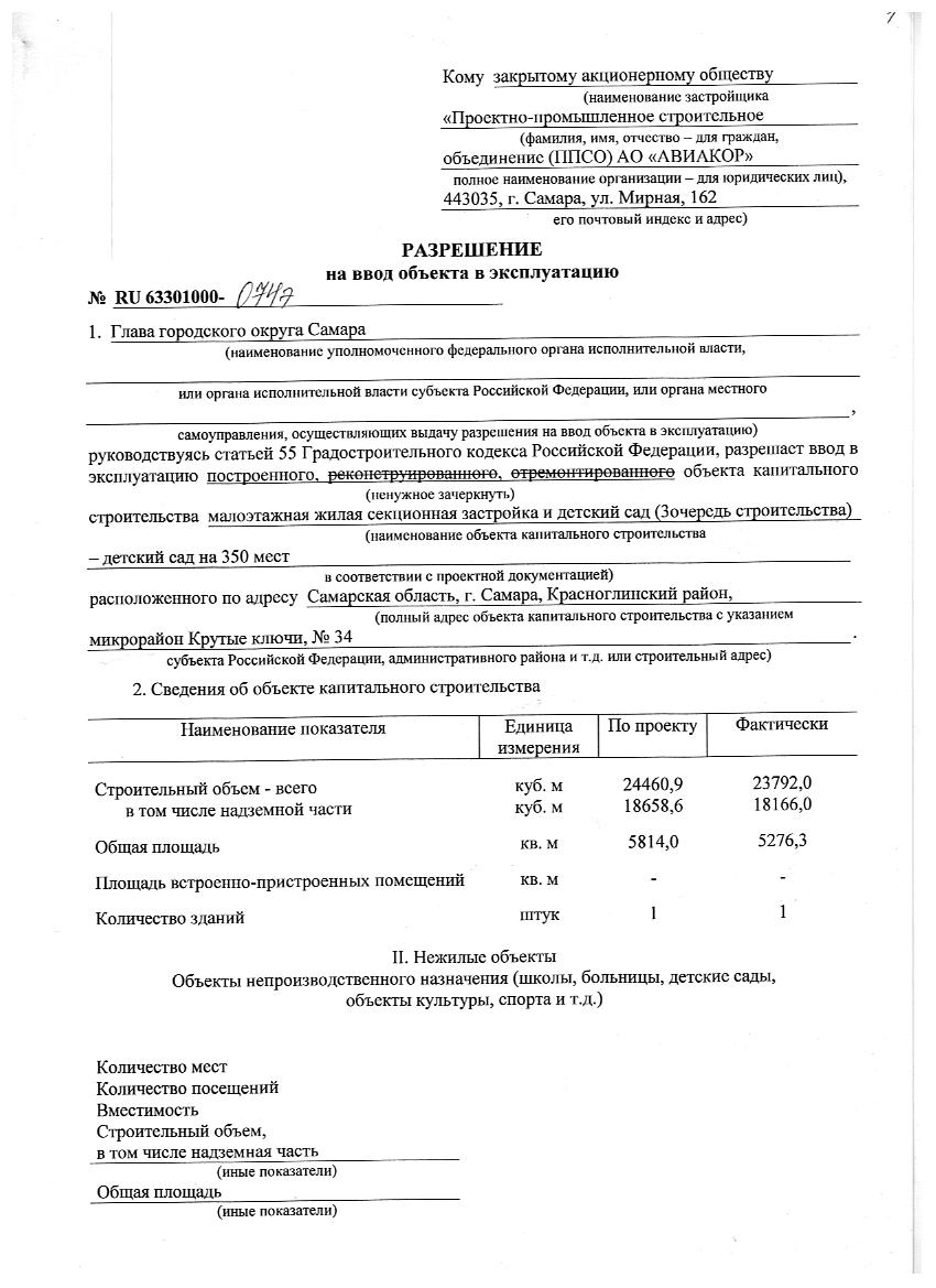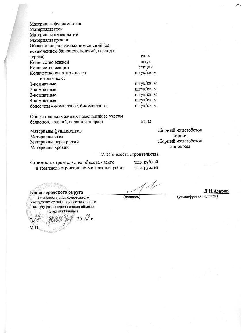Разрешение на ввод объекта в эксплуатацию малоэтажная жилая секционная застройка и детский сад (3 очередь строительства) детский сад на 350 мест от 27.12.12г.