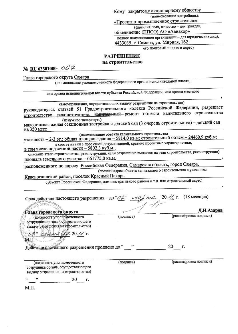 Разрешение на строительство объекта "Малоэтажная жилая секционная застройка и детский сад (3 очередь строительства) – детский сад на 350 мест" от 07.09.2011г.