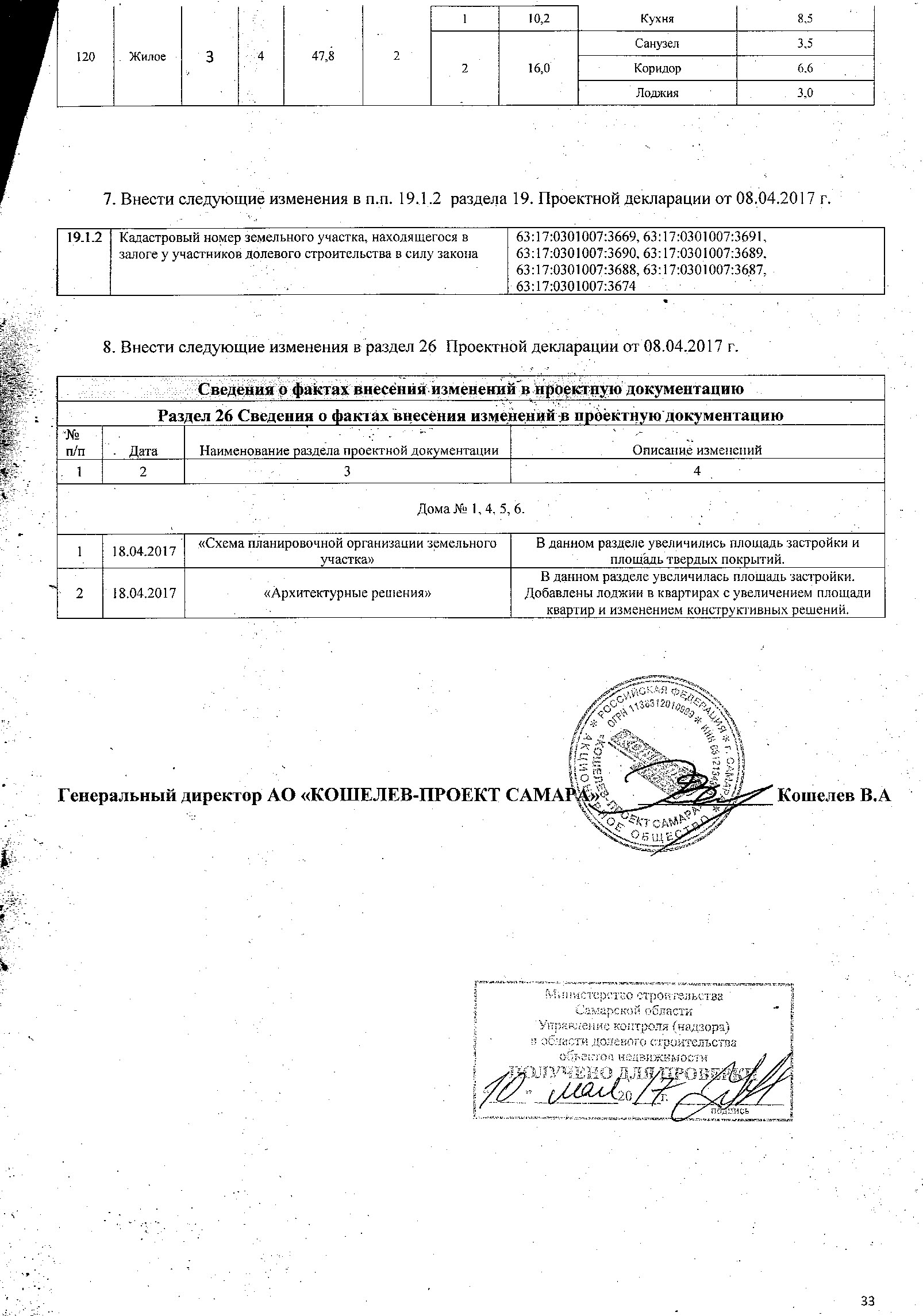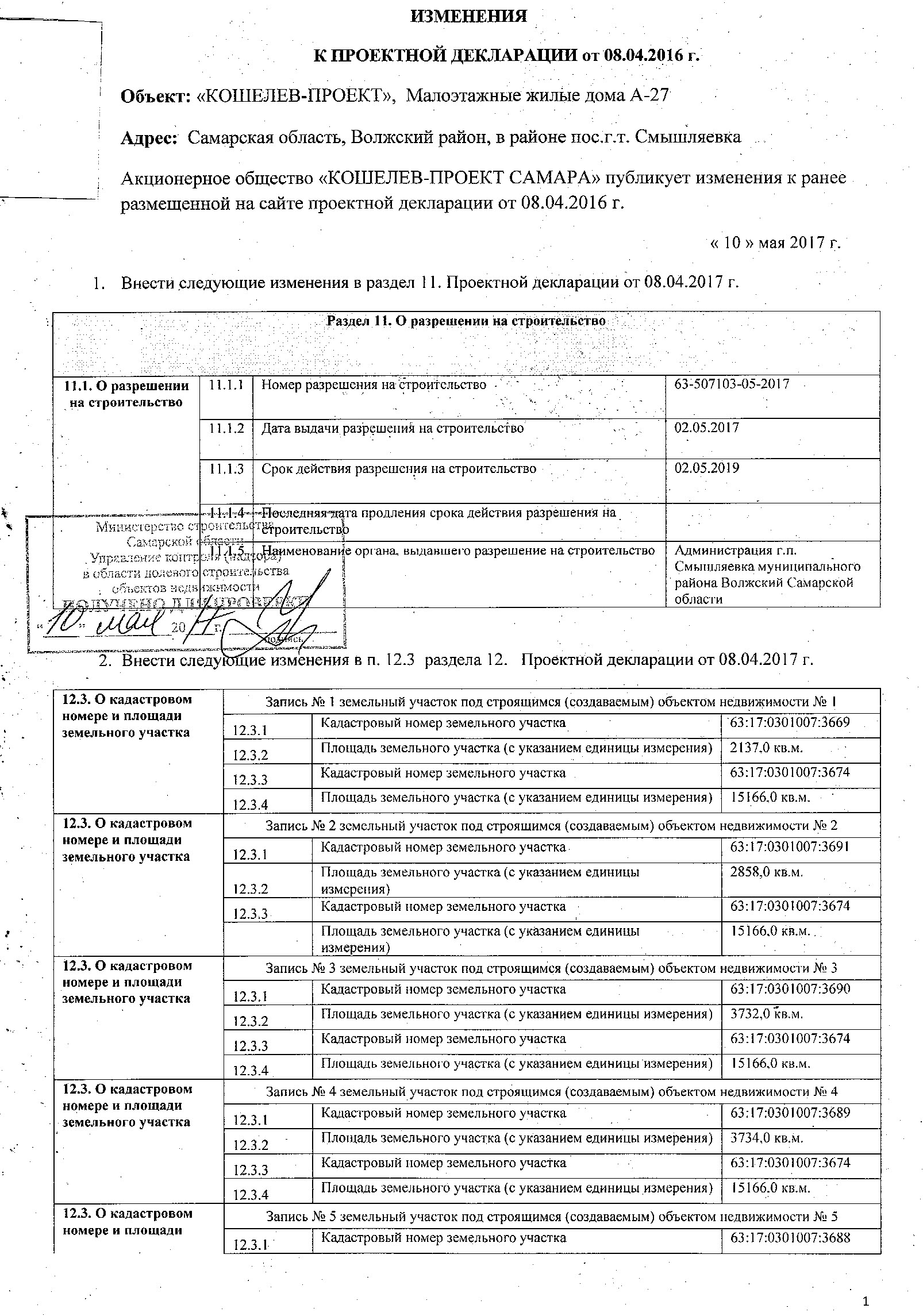 Изменения к проектной декларации объекта "КОШЕЛЕВ-ПРОЕКТ", малоэтажные дома А-27, от 10.05.2017г.
