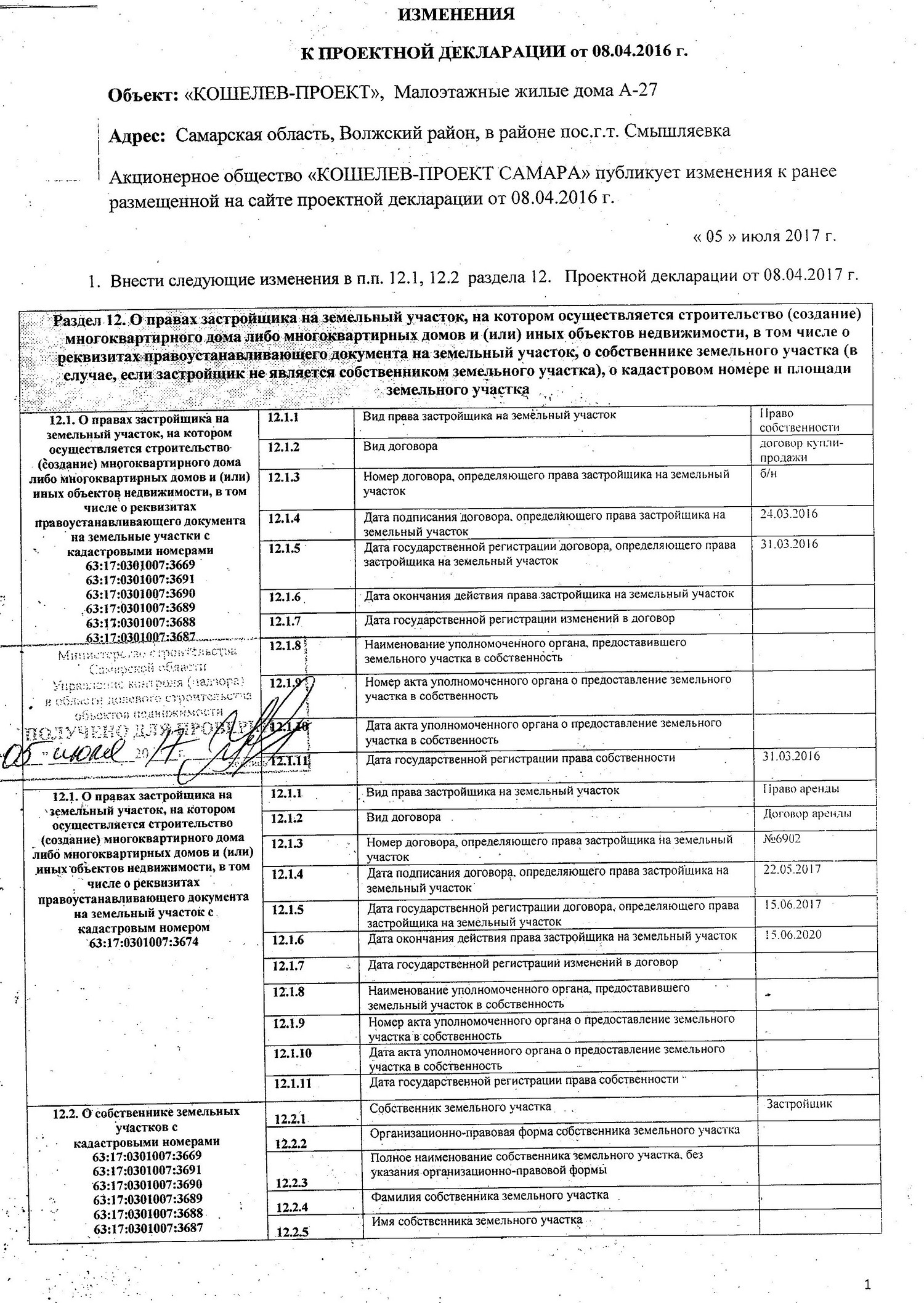 Изменения к проектной декларации объекта "КОШЕЛЕВ-ПРОЕКТ", малоэтажные жилые дома А-27, от 05.07.2017г.