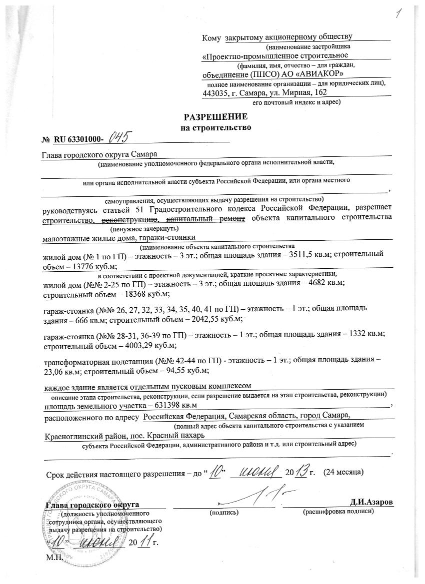 Разрешение на строительство объекта Малоэтажные жилые дома, гаражи-стоянки от 10.06.2011г.