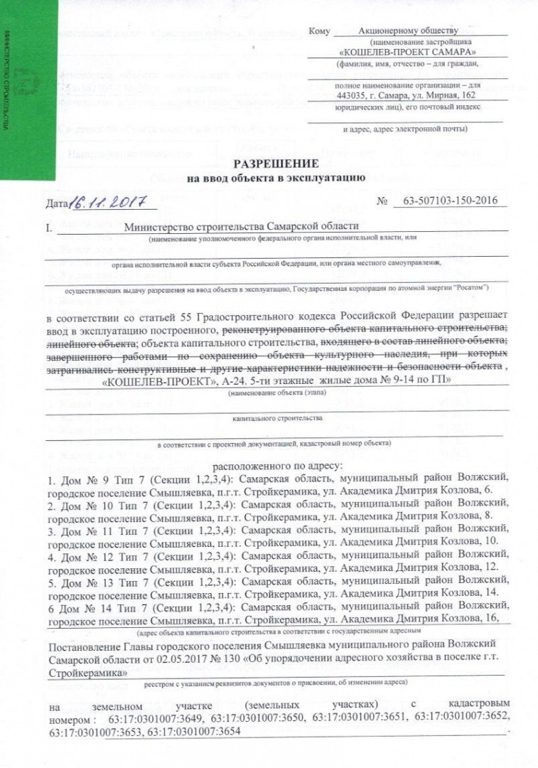 Разрешение на ввод объекта в эксплуатацию "КОШЕЛЕВ-ПРОЕКТ", А-24. 5-ти этажные жилые дома № 9-14 по ГП от 16.11.2017г.