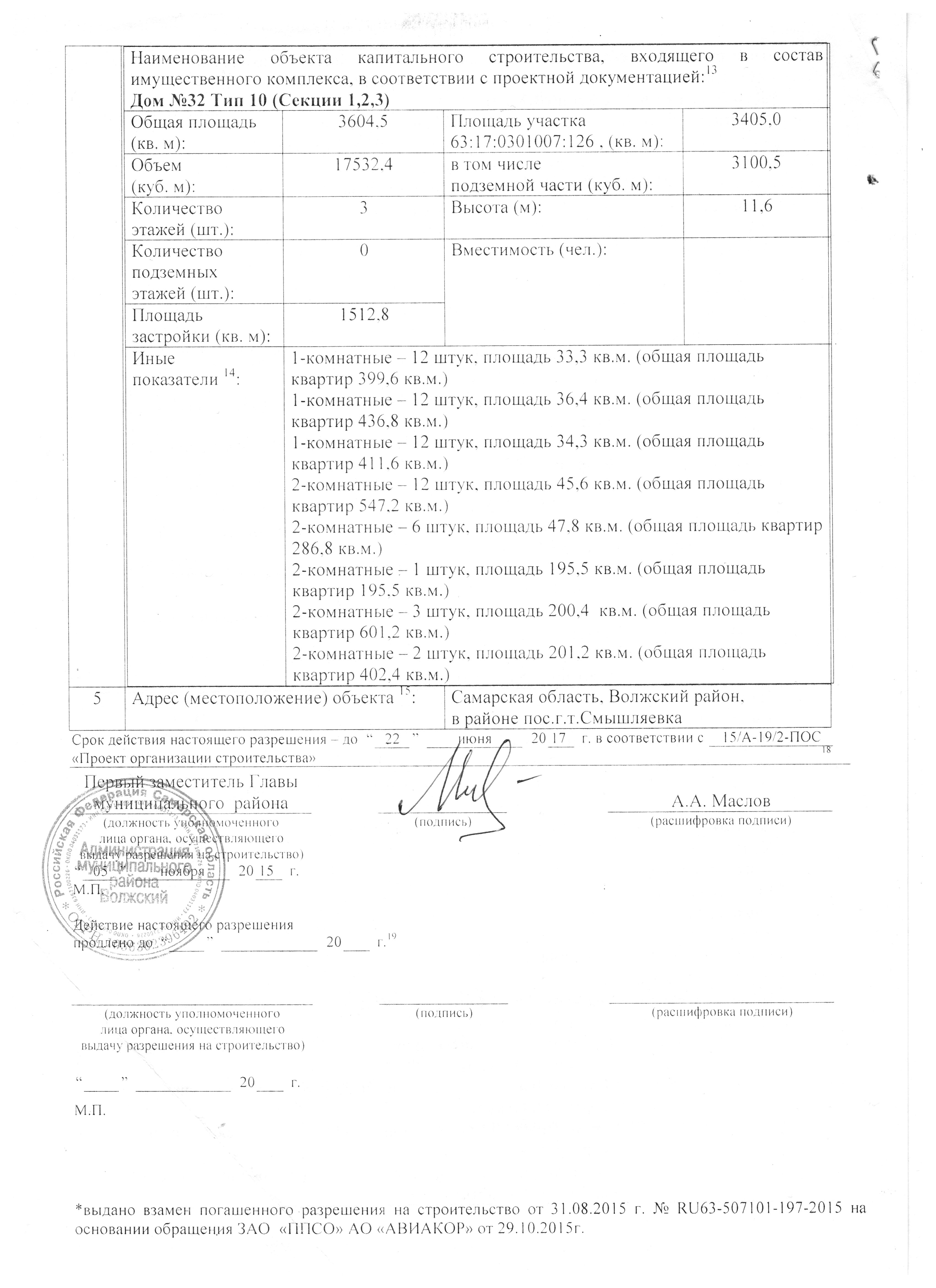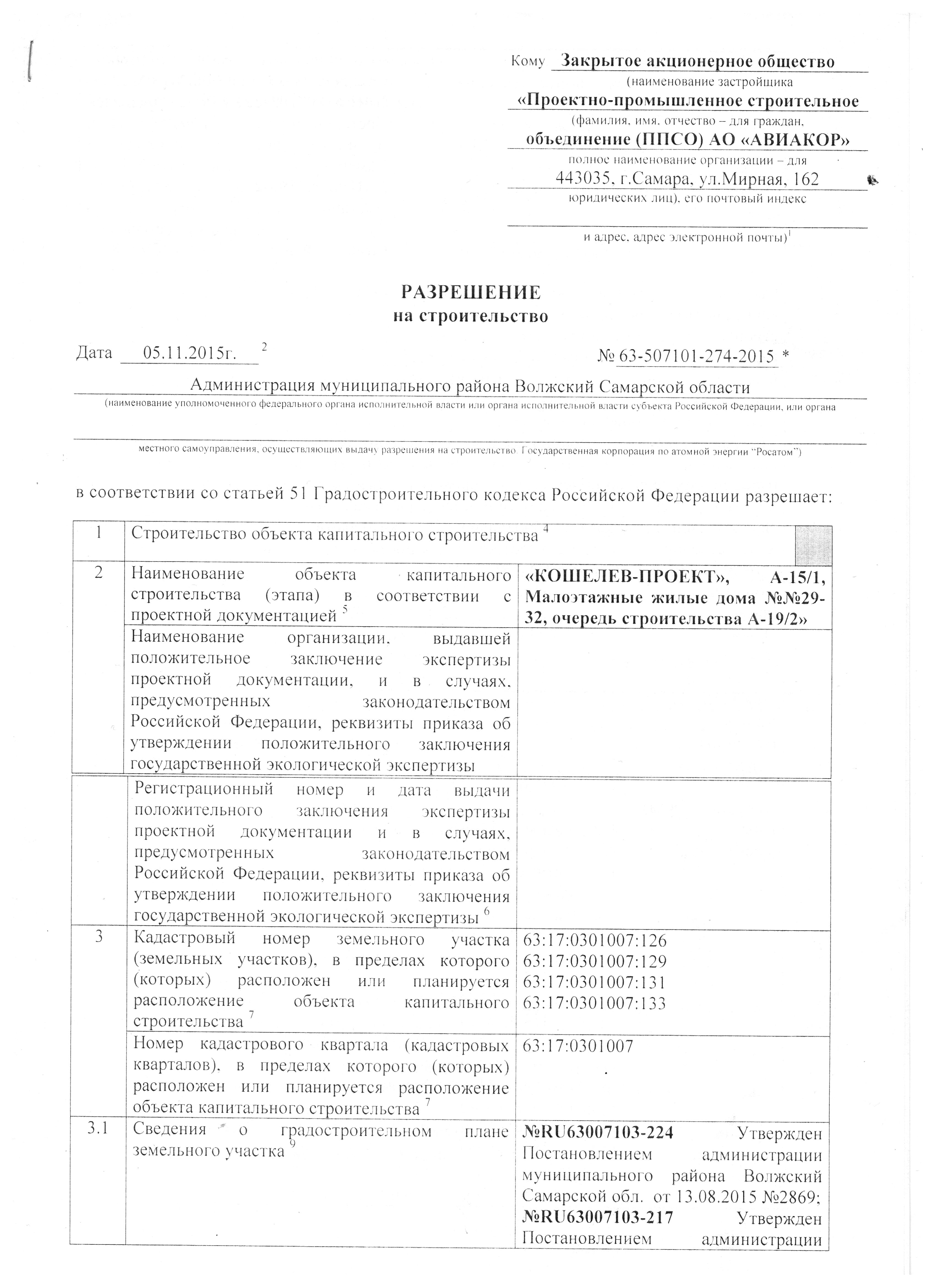 Разрешение на строительство "КОШЕЛЕВ-ПРОЕКТ" А-15/1, Малоэтажные жилые дома №№ 29-32 очередь строительства А-19/2" от 05.11.2015г.