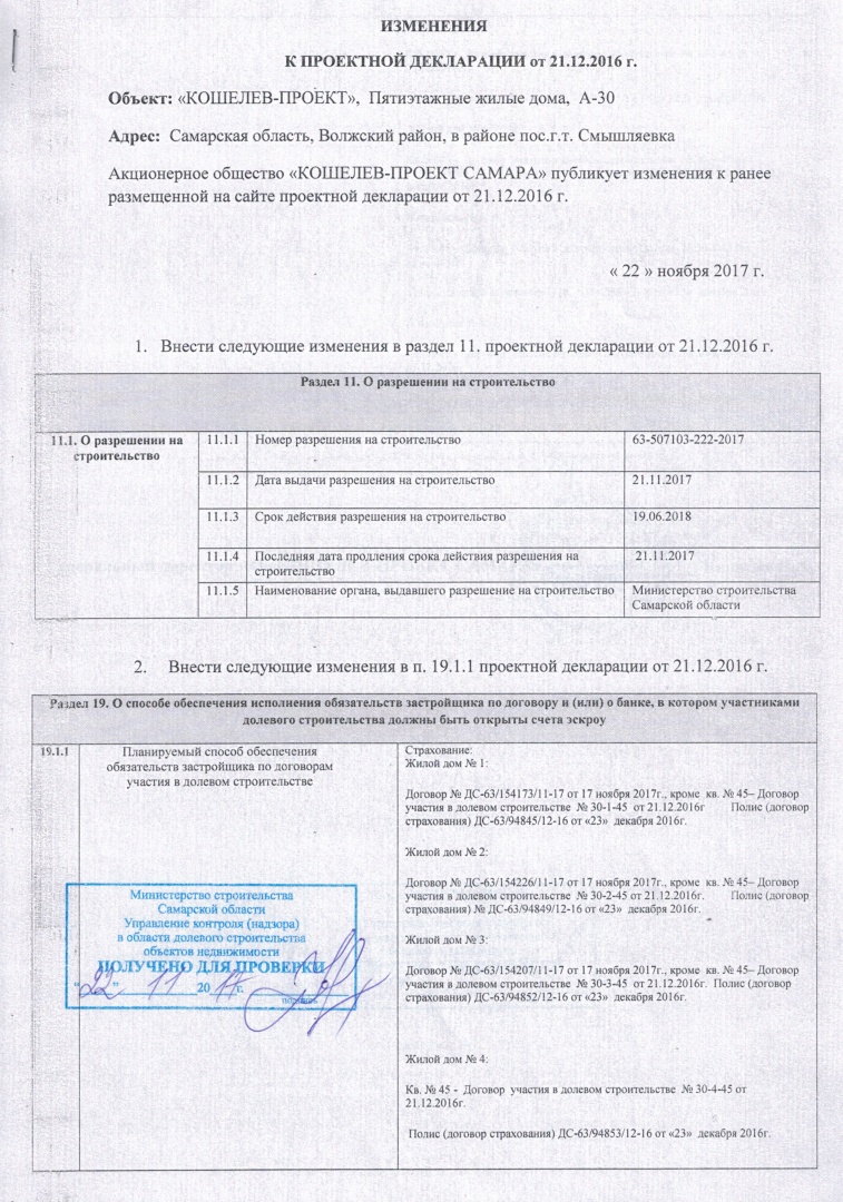 Изменения к проектной декларации объекта "КОШЕЛЕВ-ПРОЕКТ", А-30, от 22.11.17