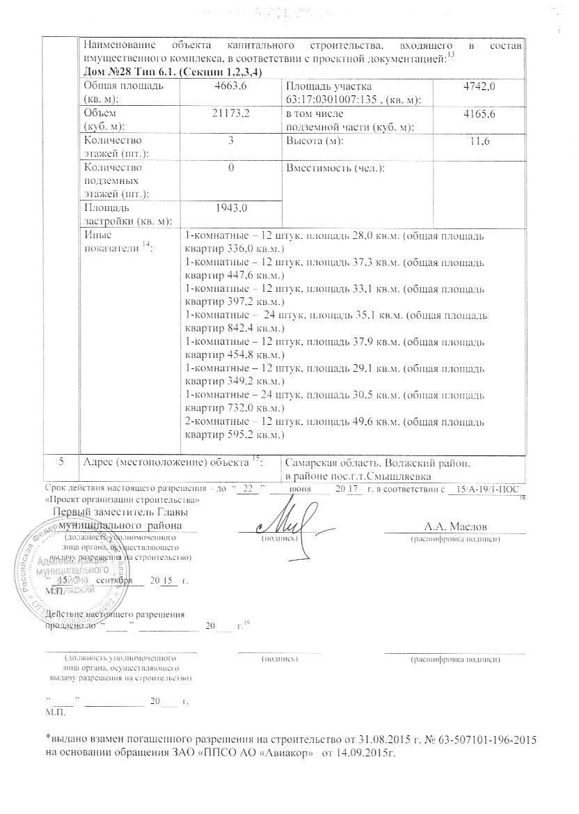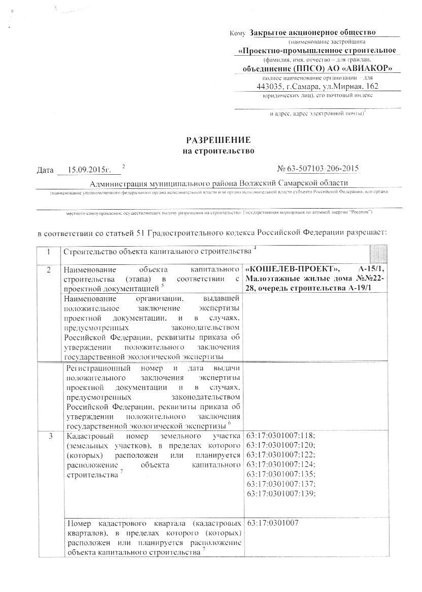 Разрешение на строительство "КОШЕЛЕВ-ПРОЕКТ" А15/1, Малоэтажные жилые дома №№ 22-28, очередь строительства А19/1 от 15.09.2015г