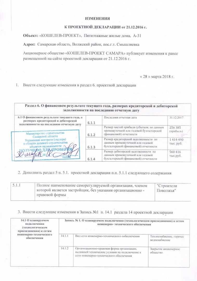 Изменения к проектной декларации объекта "Кошелев-проект, А-31" от 28.03.2018г.