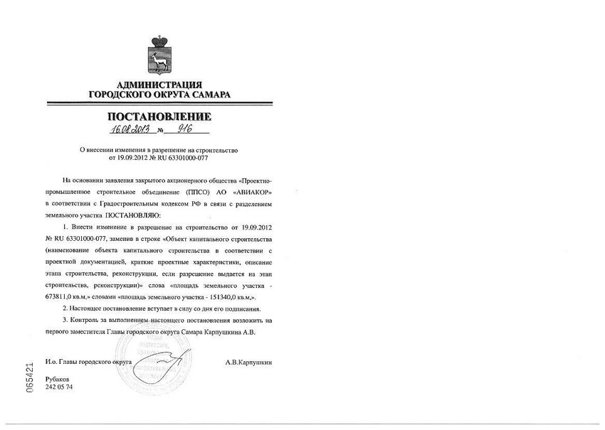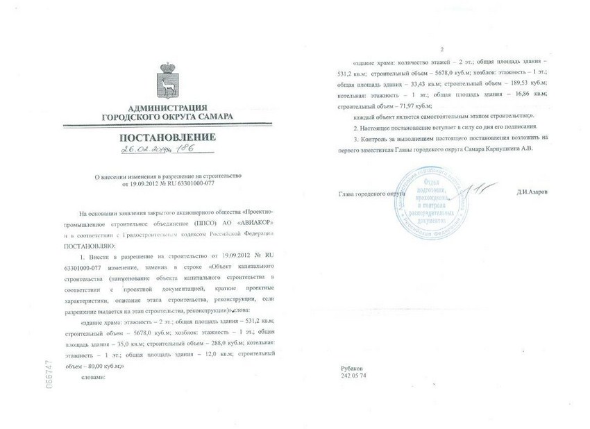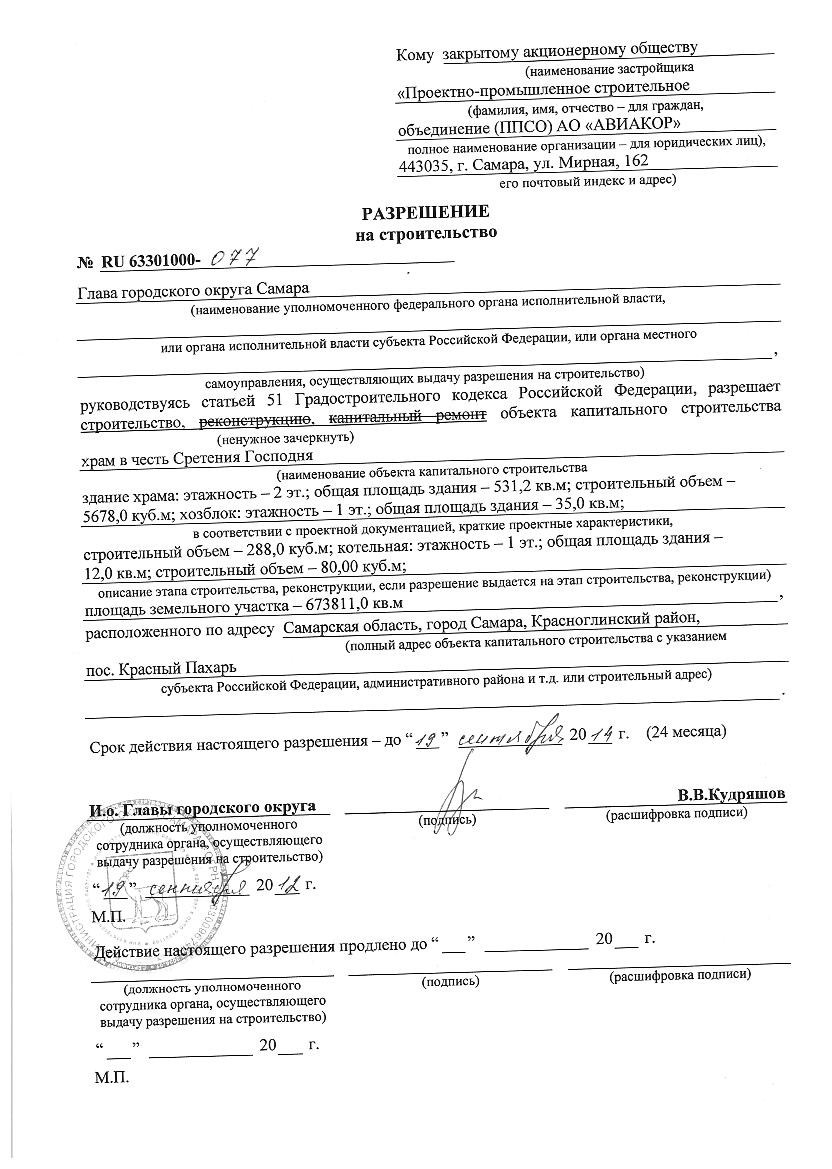Разрешение на строительство объекта "Храм в честь Сретения Господня" от 19.09.2012г.
