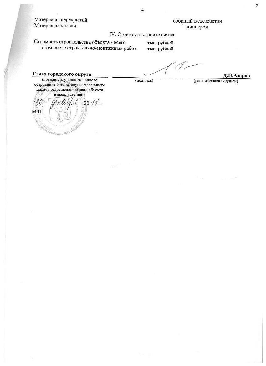 Разрешение на ввод объекта в эксплуатацию " Малоэтажная жилая застройка и детский сад" 2 очередь строительства, жилые дома №№ 7-10 по ГП от 30.12.2011г.
