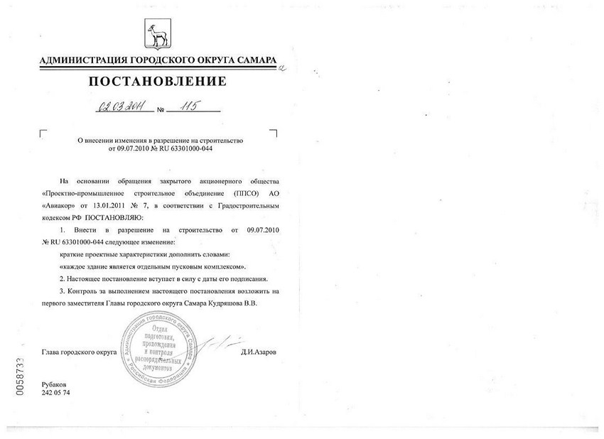 Постановление о внесении изменений в разрешение на строительство объекта "Малоэтажная жилая застройка и детский сад" 1 очередь строительства от 09.07.2010г. № 115 от 02.03.2011г.