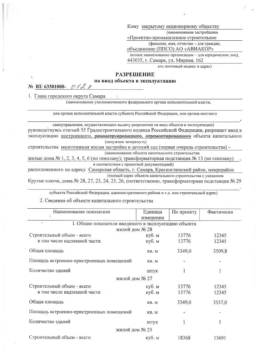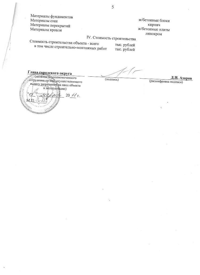 Разрешение на ввод объекта в эксплуатацию " Малоэтажная жилая застройка и детский сад" 1 очередь строительства, жилые дома №№ 1-6 по ГП от 05.03.2011г.
