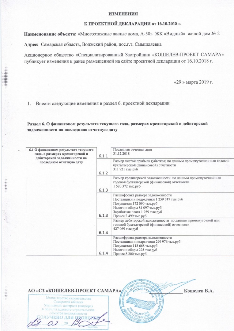 Изменения к проектной декларации объекта "Многоэтажные жилые дома, А-50" дом 2 от 29.03.2019