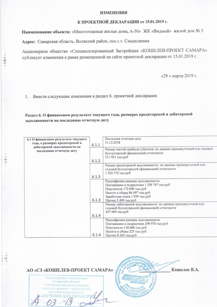Изменения к проектной декларации объекта "Многоэтажные жилые дома, А-50" дом 5 от 29.03.2019