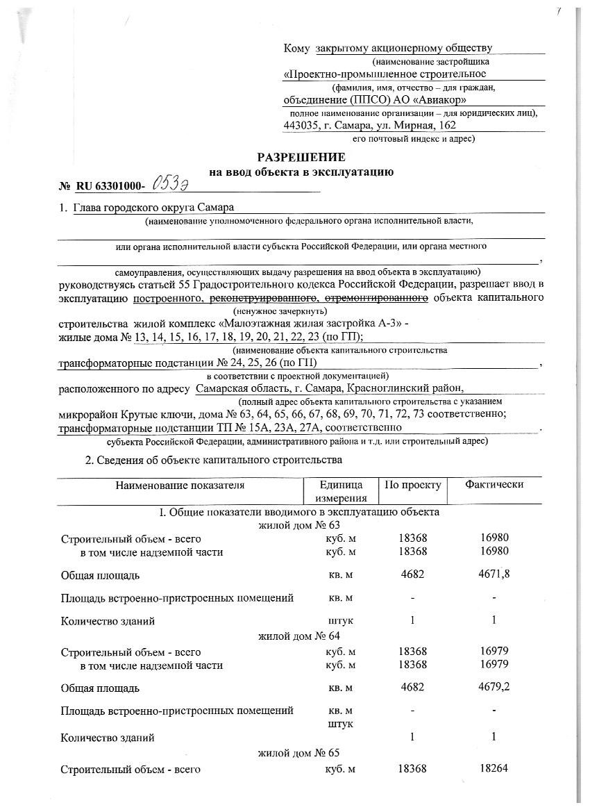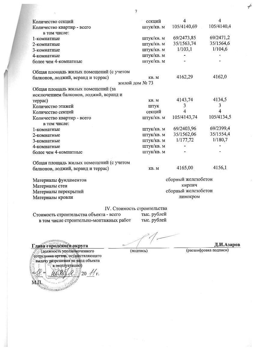 Разрешение на ввод объекта в эксплуатацию жилого комплекса "Малоэтажная жилая застройка А-3" жилые дома №№ 13-23 по ГП от 18.11.2011г.