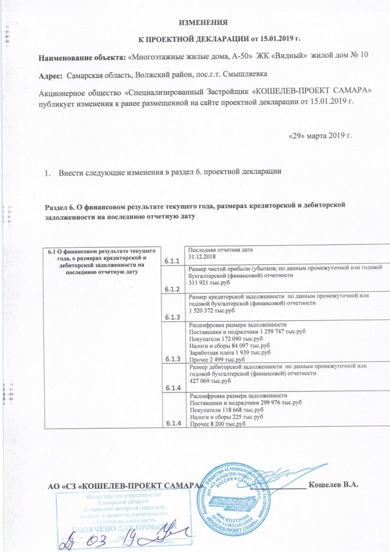 Изменения к проектной декларации объекта "Многоэтажные жилые дома, А-50" дом 10 от 29.03.2019
