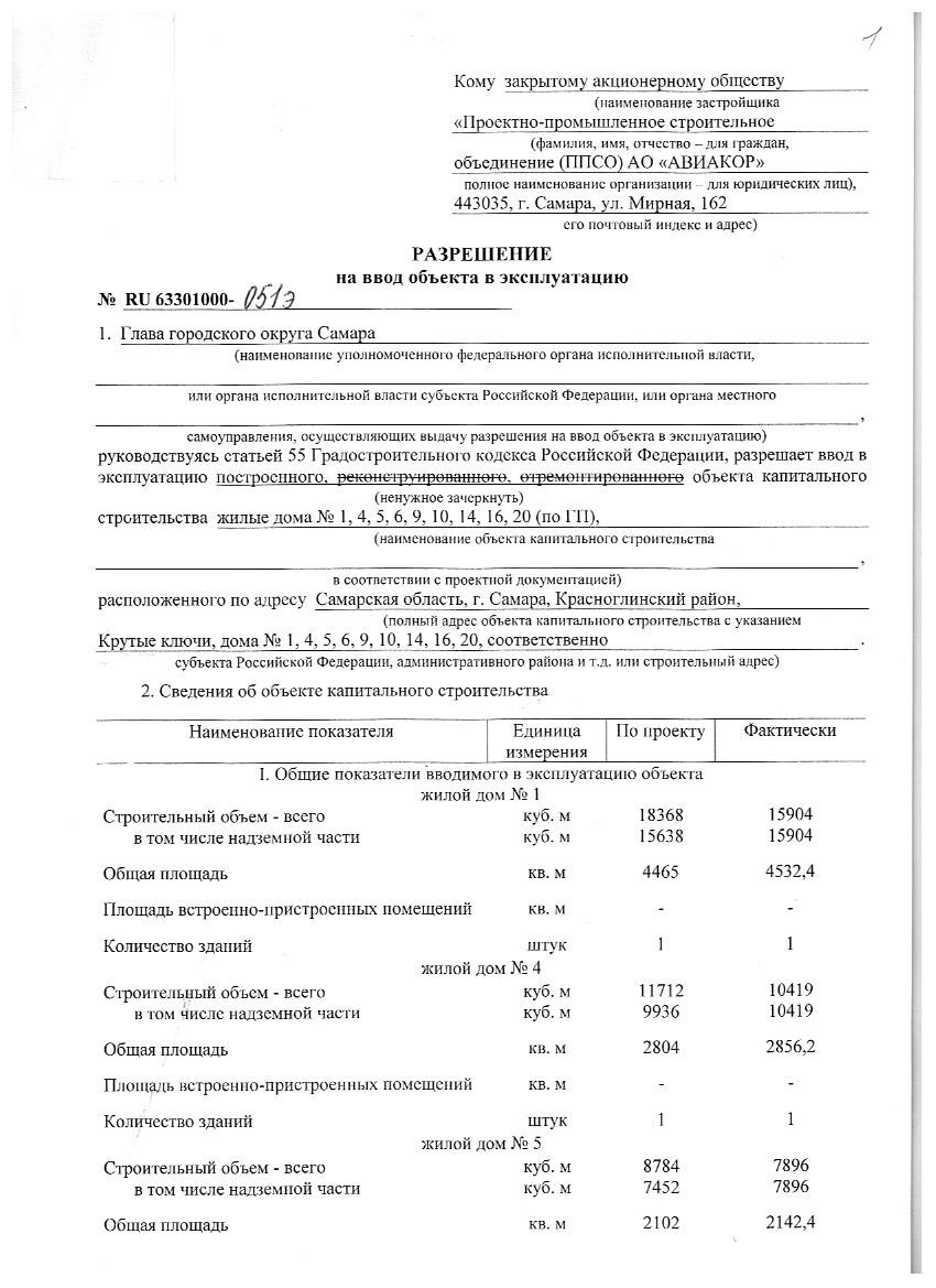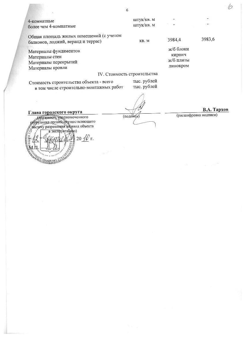 Разрешение на ввод объекта в эксплуатацию жилого комплекса: жилые дома №№ 1,4-6, 9-10, 14, 16, 20 по ГП от 12.10.2010г.