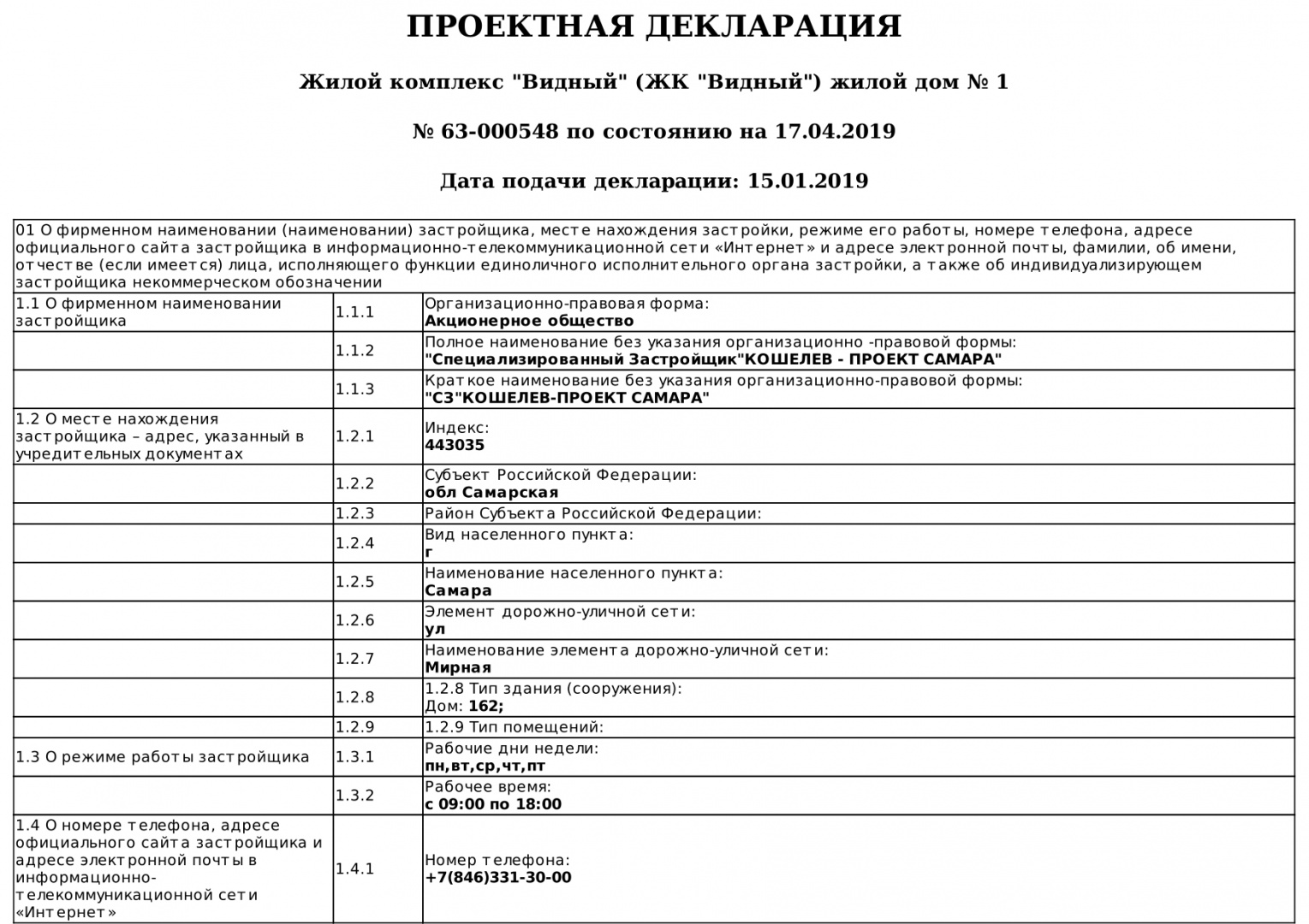 Проектная декларация (ЖК Видный) жилой дом №1 редакция от 17.04.2019г.