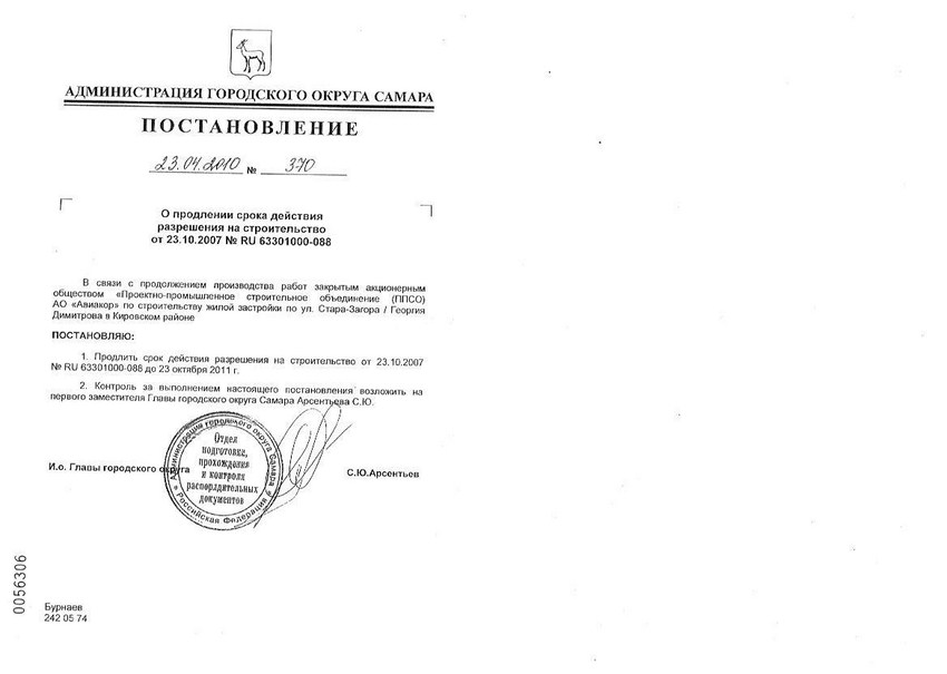 Постановление № 370 от 23.04.2010г. о продлении срока действия Разрешения на строительство от 23.10.2007г.